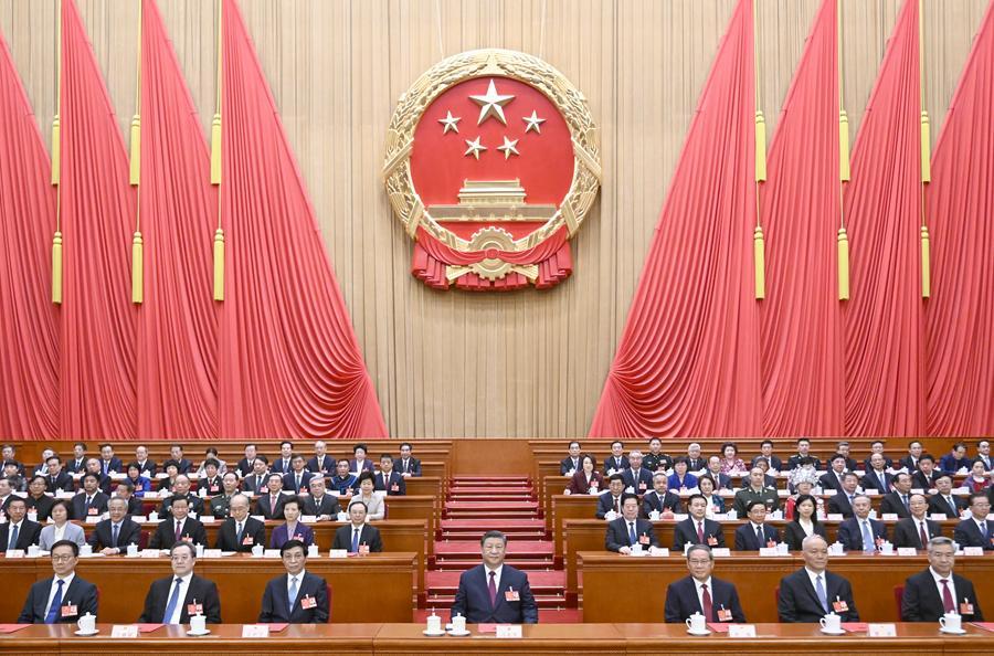 習(xí)近平、李強、王滬寧、蔡奇、丁薛祥、李希、韓正和大會主席團成員在主席臺就座。