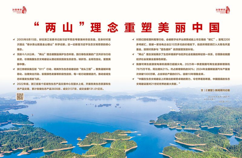 時(shí)代是思想之母,實(shí)踐是理論之源。進(jìn)入新時(shí)代,“綠水青山就是金山銀山”的理念內(nèi)涵在中國(guó)式現(xiàn)代化偉大實(shí)踐中不斷豐富拓展,成為習(xí)近平生態(tài)文明思想的原創(chuàng)性、標(biāo)識(shí)性概念。從省域?qū)嵺`到引領(lǐng)全局,“兩山”理念重塑美麗中國(guó),神州大地?zé)òl(fā)新綠。
