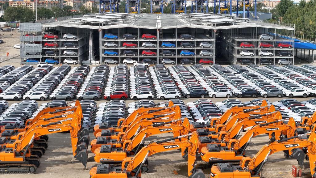 10月20日,國(guó)產(chǎn)汽車和工程機(jī)械在山東港口煙臺(tái)港集結(jié)等待裝船出口(無(wú)人機(jī)照片)。新華社發(fā)(唐克攝)