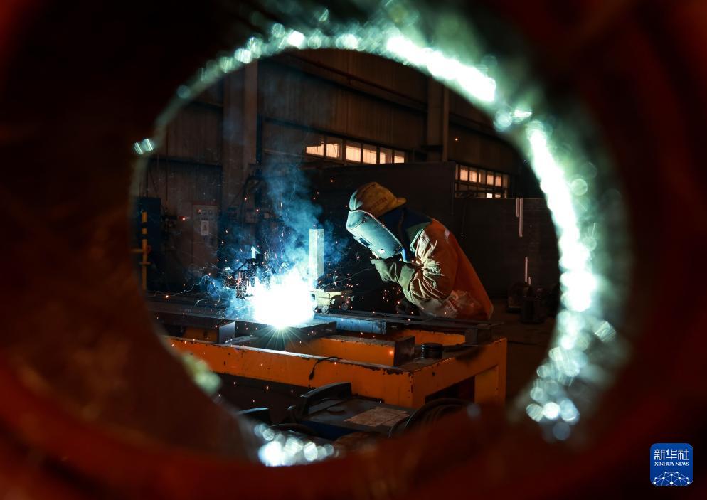 10月27日,中鐵科工集團(tuán)軌道交通裝備有限公司技術(shù)工人對(duì)盾構(gòu)機(jī)盾體配件進(jìn)行電焊作業(yè)。