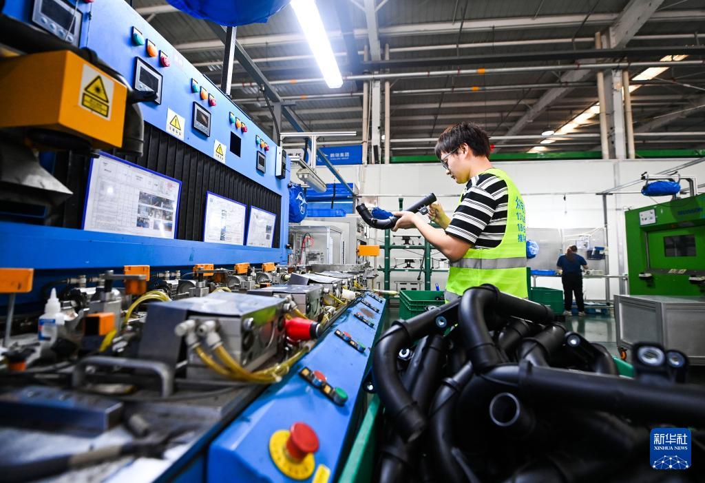 11月5日,工作人員在位于天津市濱海新區(qū)中塘鎮(zhèn)的天津鵬翎集團股份有限公司生產車間檢查汽車膠管產品。