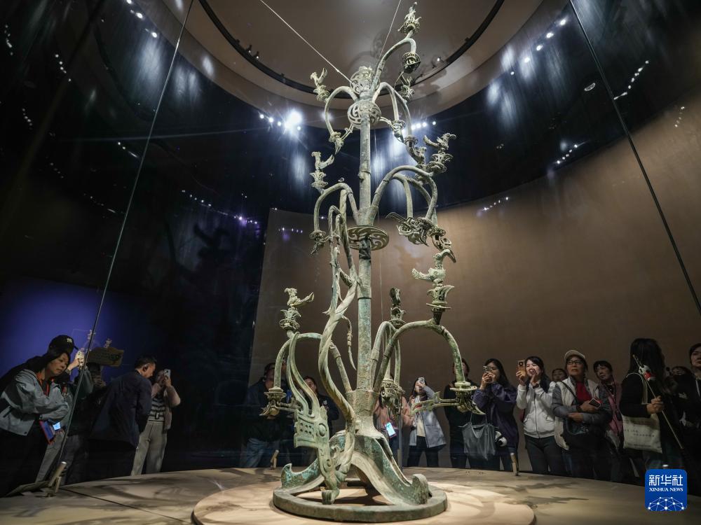游客在四川省廣漢市三星堆博物館參觀青銅神樹(10月30日攝)。