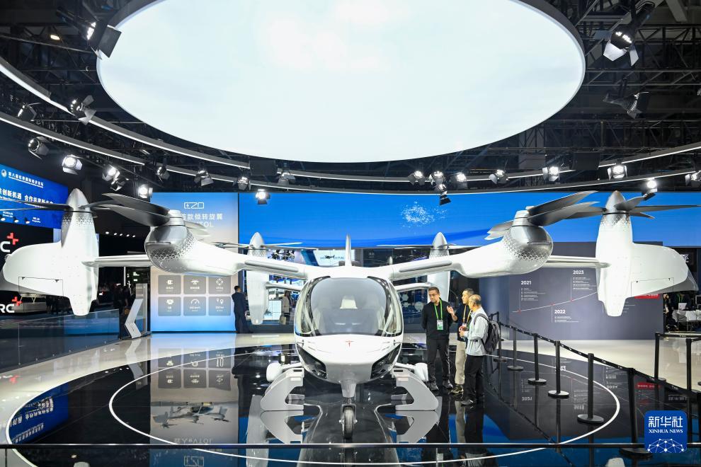11月6日,在第八屆進博會汽車及智慧出行展區(qū)的科技展臺,展商(中)在向觀眾介紹E20 eVTOL電動垂直起降飛行器。