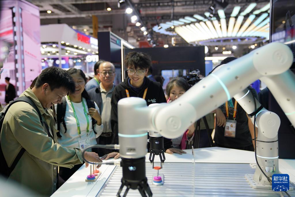 11月6日,參觀者在國家會展中心(上海)技術(shù)裝備展區(qū)西門子展臺與AI進行游戲互動。