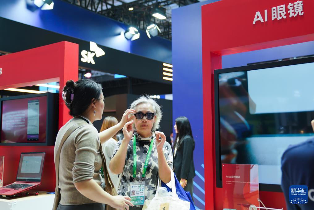 11月6日,參觀者在國家會展中心(上海)技術(shù)裝備展區(qū)高通公司展臺試戴一款AI眼鏡。