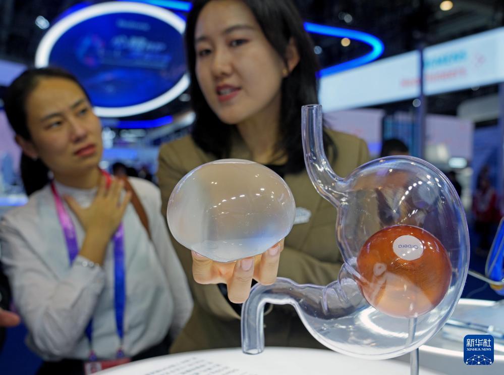 11月6日,在第八屆進博會醫(yī)療器械與醫(yī)療保健展區(qū),工作人員在介紹減重創(chuàng)新產(chǎn)品Orbera365胃內(nèi)球囊,可通過內(nèi)窺鏡從口腔送入胃內(nèi)以占據(jù)胃容積,減少患者進食量,增強飽腹感,以實現(xiàn)減重。