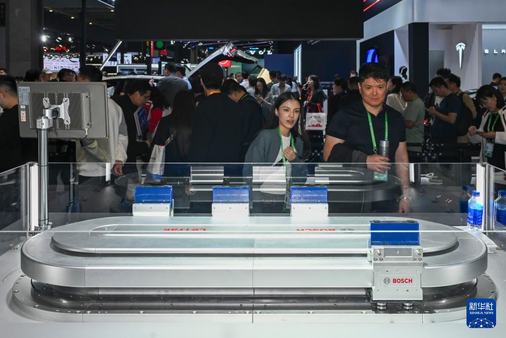 11月6日,在第八屆進博會汽車及智慧出行展區(qū)博世展臺,人們在展品LeTrak?磁驅(qū)柔性傳輸系統(tǒng)Pro版前交流。