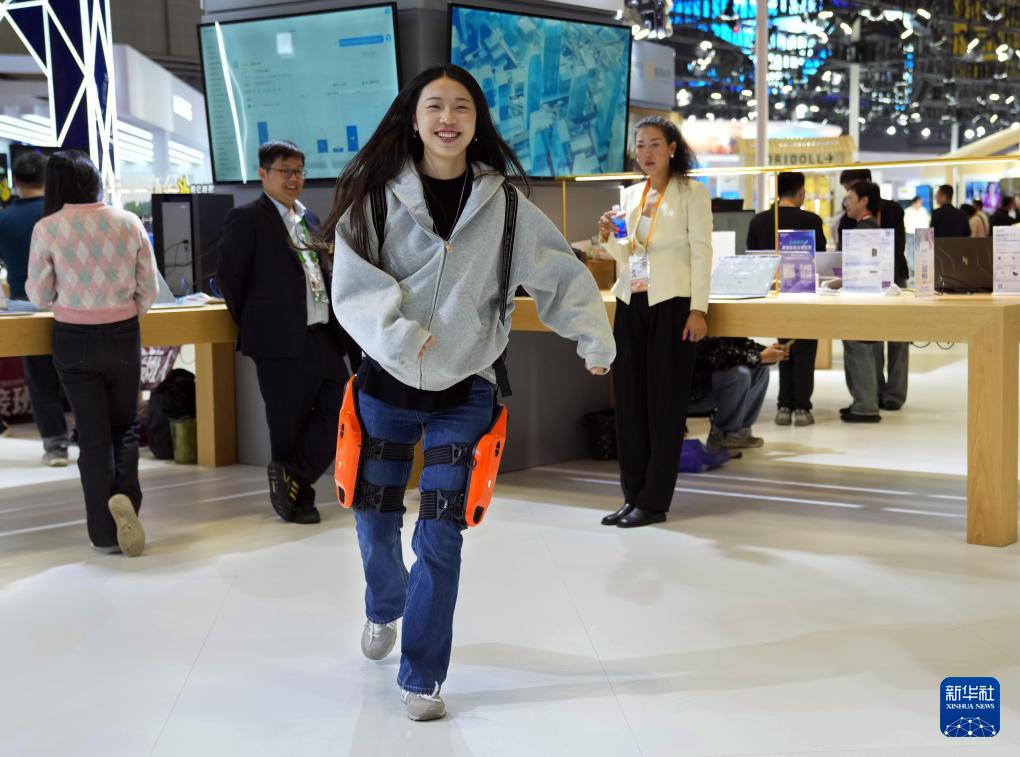 11月6日,在第八屆進博會技術(shù)裝備展區(qū),參觀者體驗穿戴機械外骨骼運動。