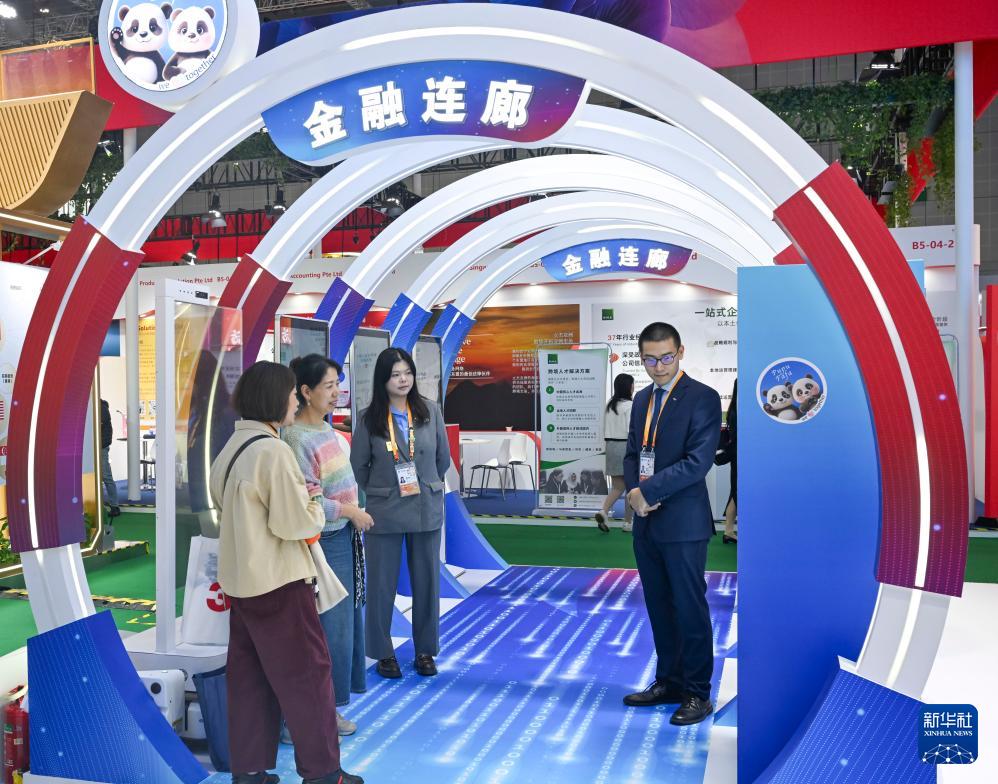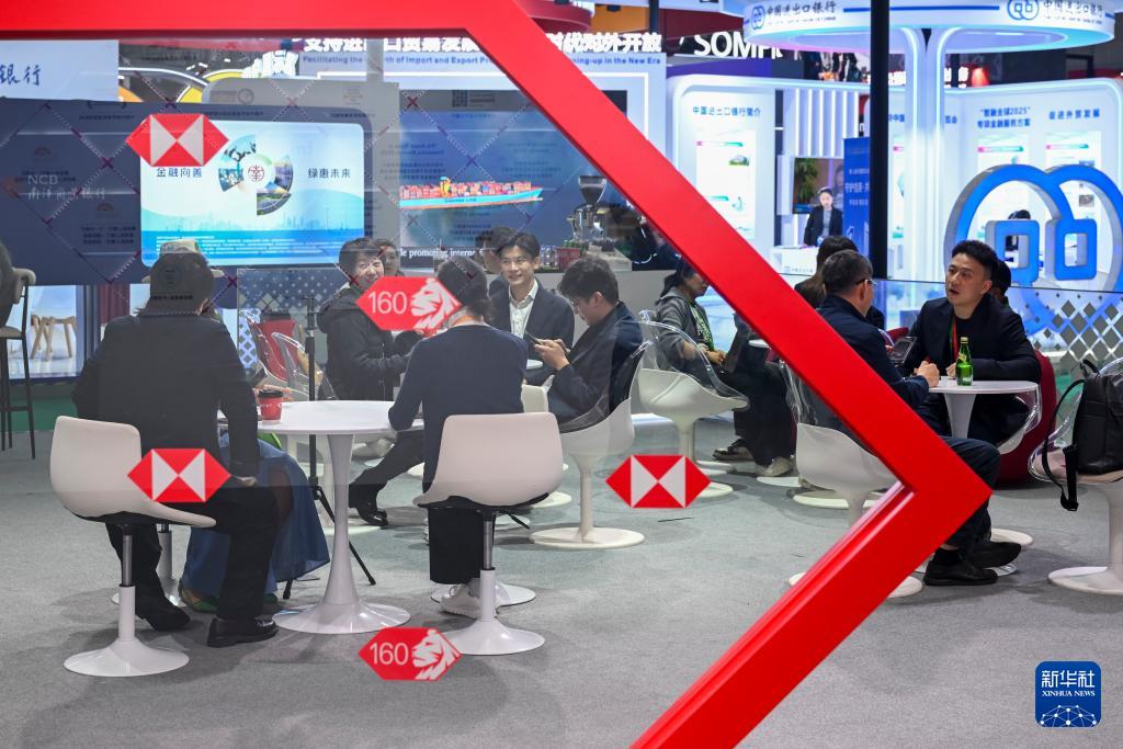 11月9日,人們?cè)诘诎藢眠M(jìn)博會(huì)服務(wù)貿(mào)易展區(qū)匯豐展臺(tái)交流。