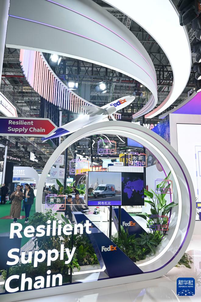11月9日,人們?cè)诘诎藢眠M(jìn)博會(huì)服務(wù)貿(mào)易展區(qū)聯(lián)邦快遞(FedEx)展臺(tái)交流。