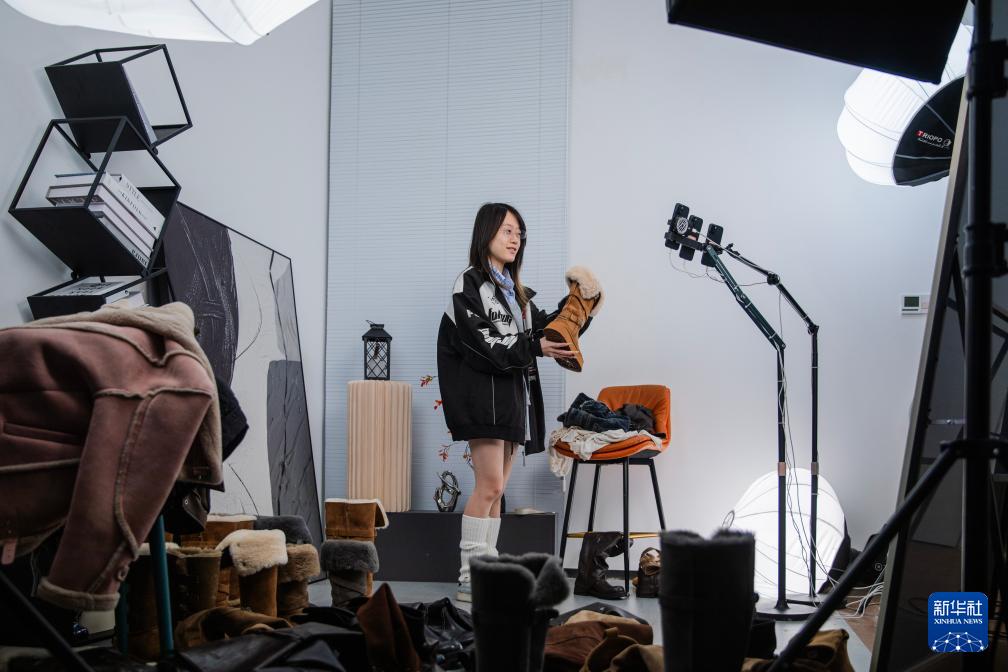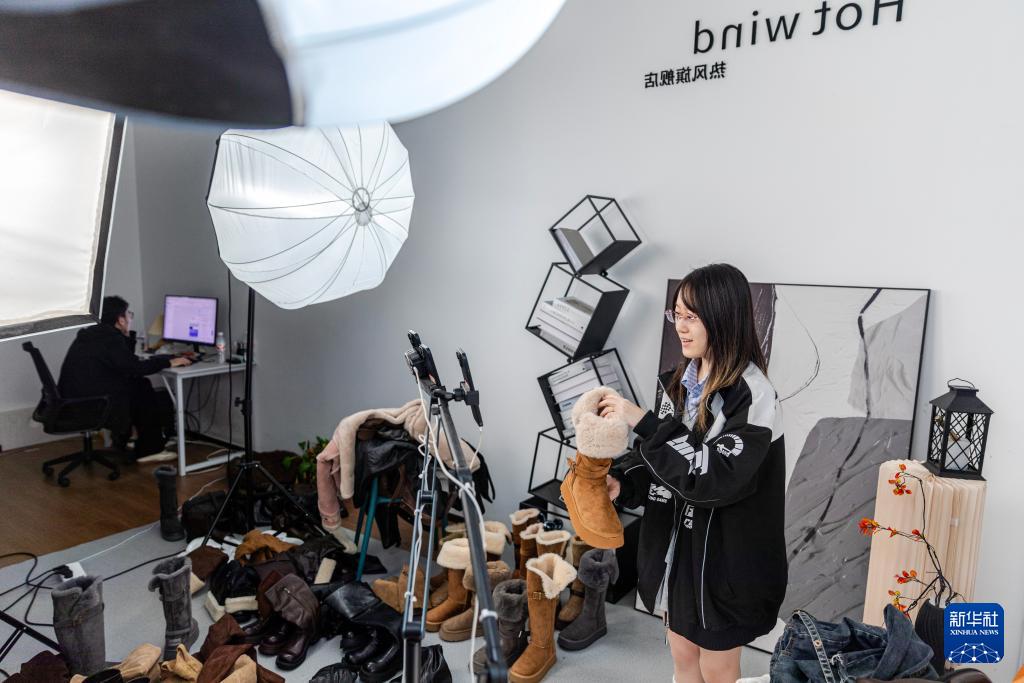 11月10日,在浙江省溫州市甌海區(qū)的一家網(wǎng)絡(luò)科技公司,主播通過網(wǎng)絡(luò)直播銷售鞋子。