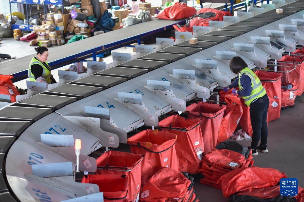 11月10日,工作人員在中國郵政集團(tuán)有限公司山東棗莊市分公司寄遞事業(yè)部網(wǎng)路運營中心分揀快遞。