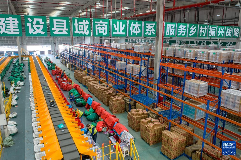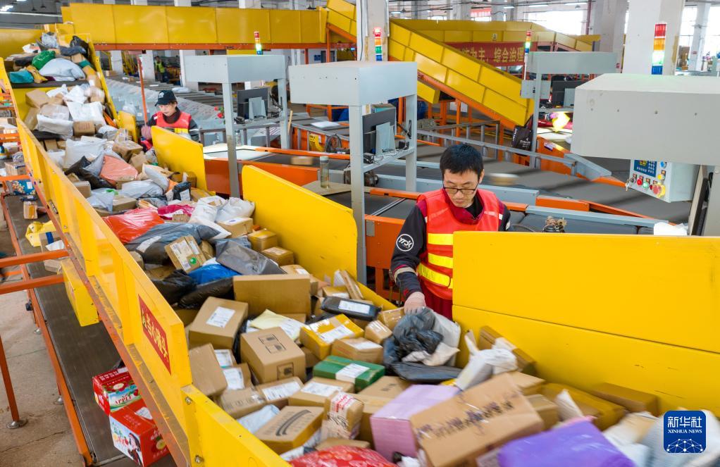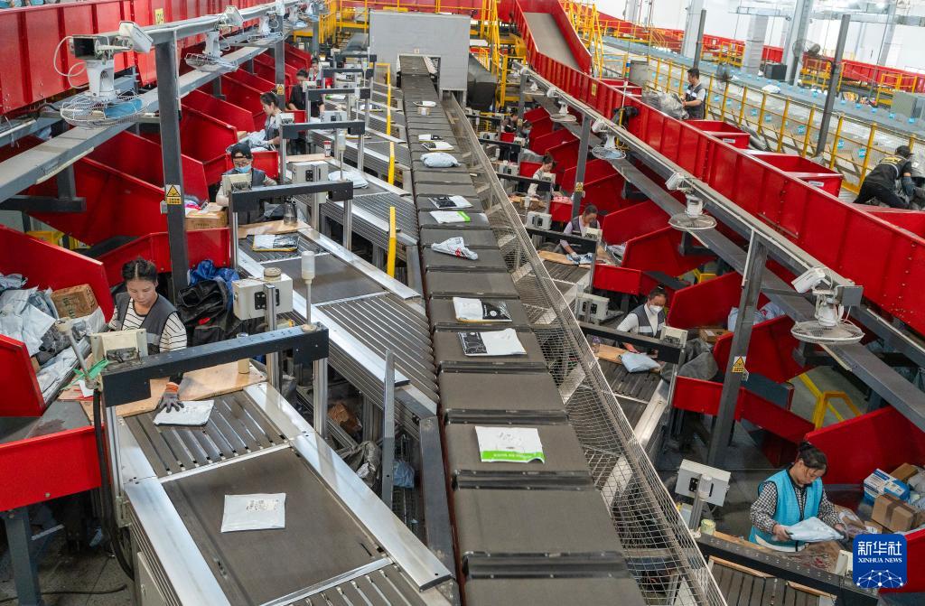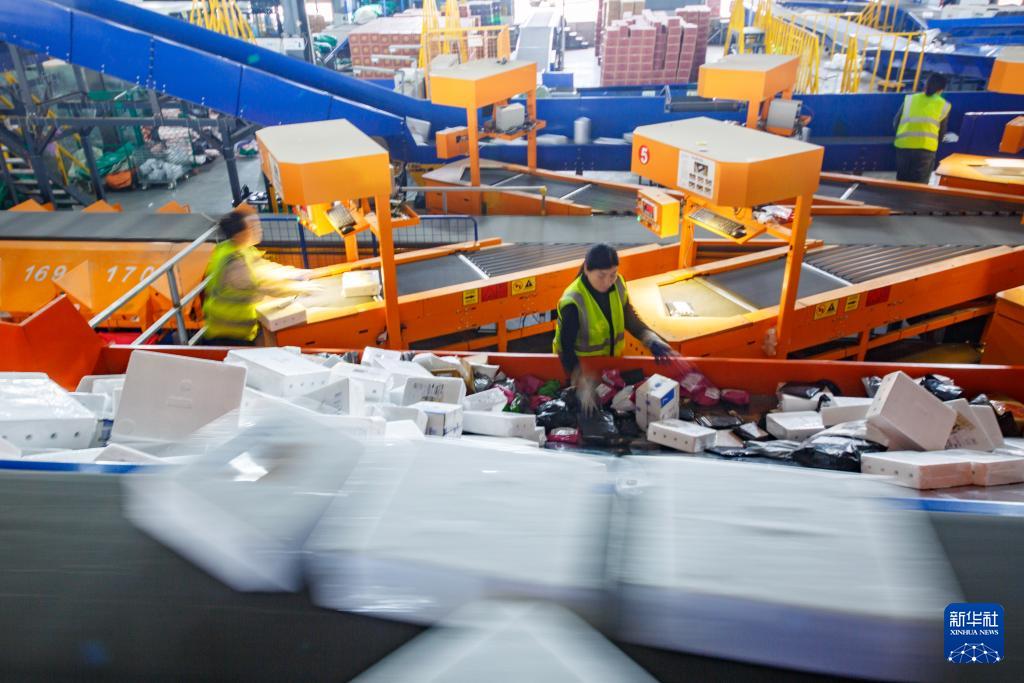 11月10日,工作人員在貴州省黔南布依族苗族自治州都勻市電商快遞物流園分揀包裹。