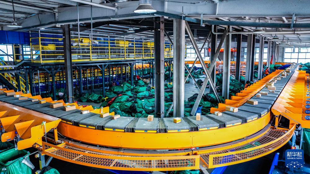 11月10日,工作人員在貴州省安順市順豐集轉(zhuǎn)中心快遞流水線上分揀快遞包裹(無人機(jī)照片)。
