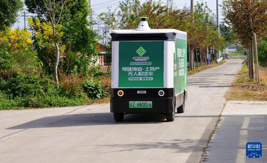 11月10日,在江蘇省海安市墩頭鎮(zhèn)長垎村,一輛載有快遞包裹的無人快遞配送車行駛在村道上。