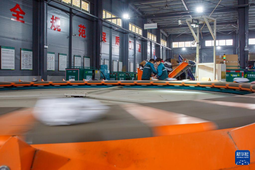 11月10日,在中國郵政集團(tuán)有限公司河南省睢縣分公司郵件處理中心,工作人員在智能快遞流水線上分揀快遞郵件。