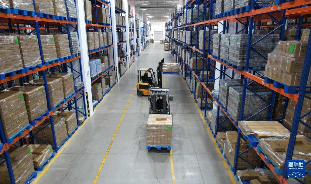 11月10日,在江蘇省連云港市連云區(qū)一家電商物流倉庫,工作人員在轉(zhuǎn)運貨物。