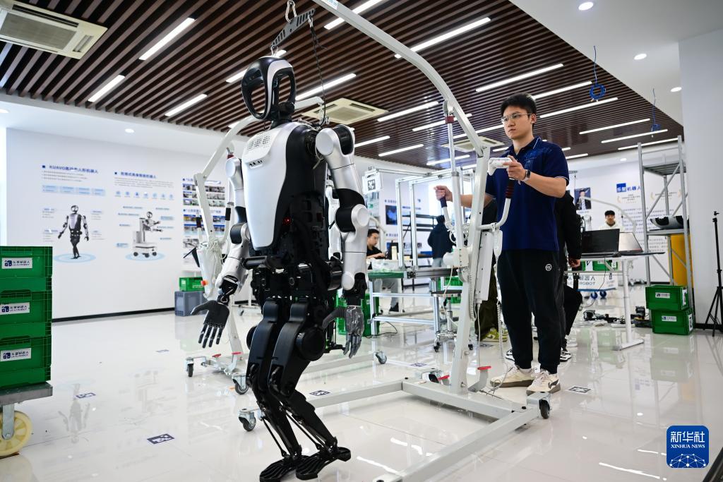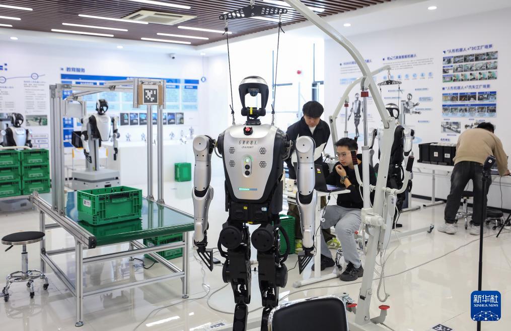 10月24日,在合肥樂聚機器人技術有限公司,工作人員在查看人形機器人的測試數據。新華社記者 杜瀟逸 攝