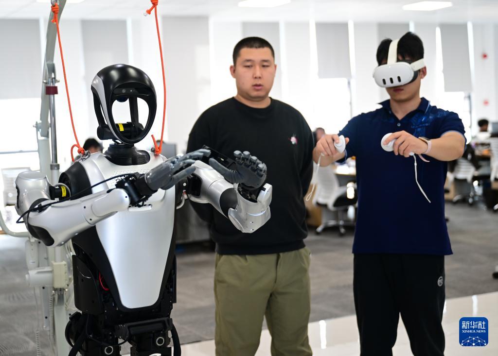 10月24日,張鴻偉(右)在同事的指導下使用VR設備進行機器人遙操作,用于動作捕獲采集數據。新華社記者 周牧 攝