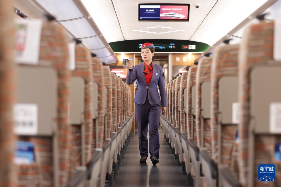11月17日,乘務(wù)員在一列試驗動車組內(nèi)工作。