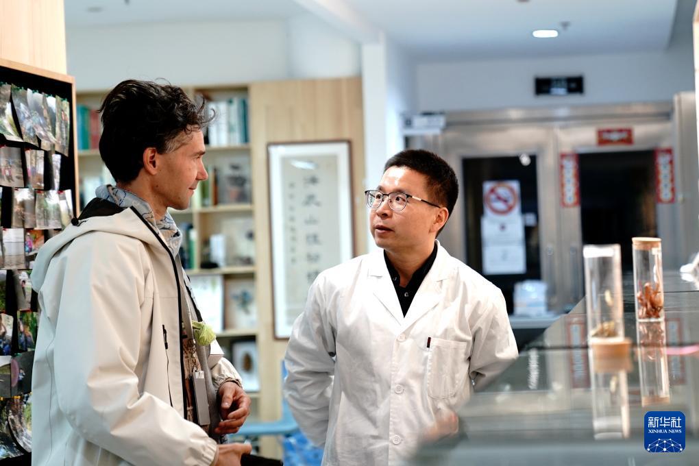 11月19日,上海辰山植物標(biāo)本館館長葛斌杰(右)在辰山中心給一位外國藝術(shù)家介紹種子知識(shí)。
