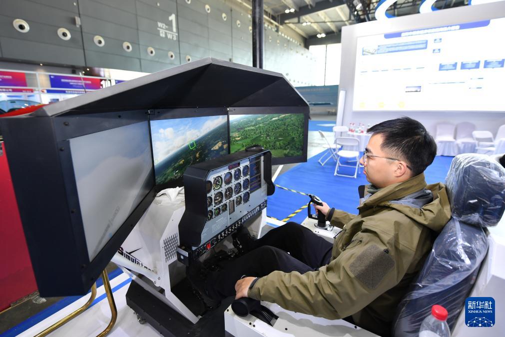 11月21日,觀眾在長(zhǎng)沙國(guó)際會(huì)展中心操作模擬飛機(jī)。