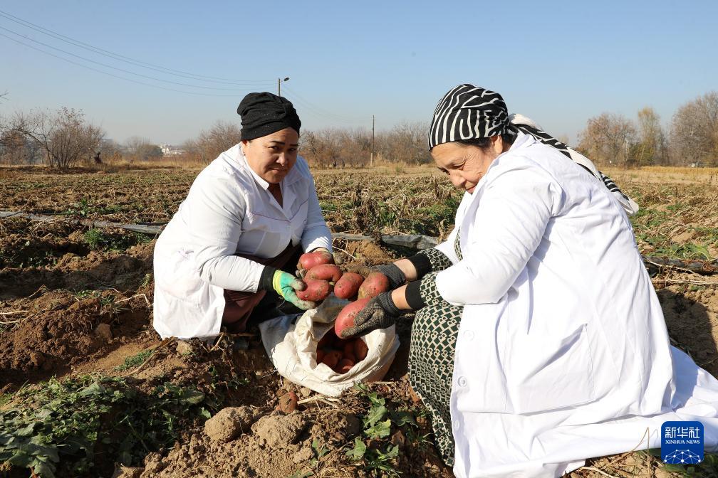 11月25日,在烏茲別克斯坦首都塔什干,烏茲別克斯坦科學院遺傳學與植物實驗生物學研究所人員在試驗田收獲馬鈴薯。