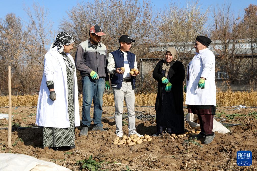 11月25日,在烏茲別克斯坦首都塔什干,烏茲別克斯坦科學院遺傳學與植物實驗生物學研究所人員在試驗田查看馬鈴薯。