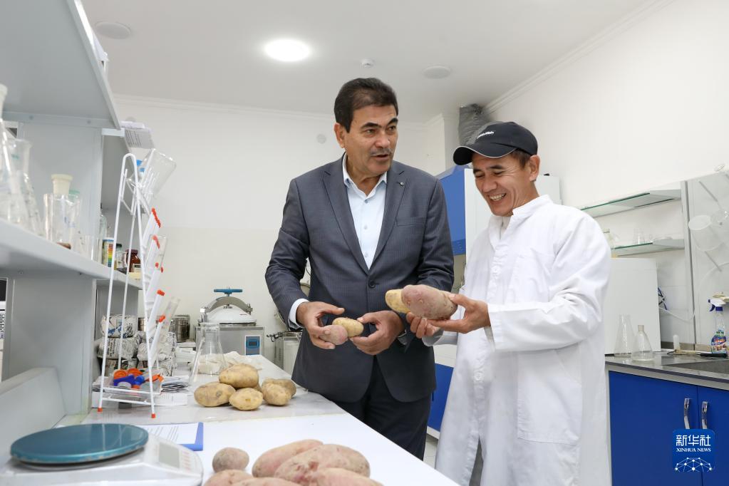 11月25日,在烏茲別克斯坦首都塔什干,烏茲別克斯坦科學院遺傳學與植物實驗生物學研究所所長納里馬諾夫(左)和該所高級研究員欽尼庫洛夫展示收獲的馬鈴薯。