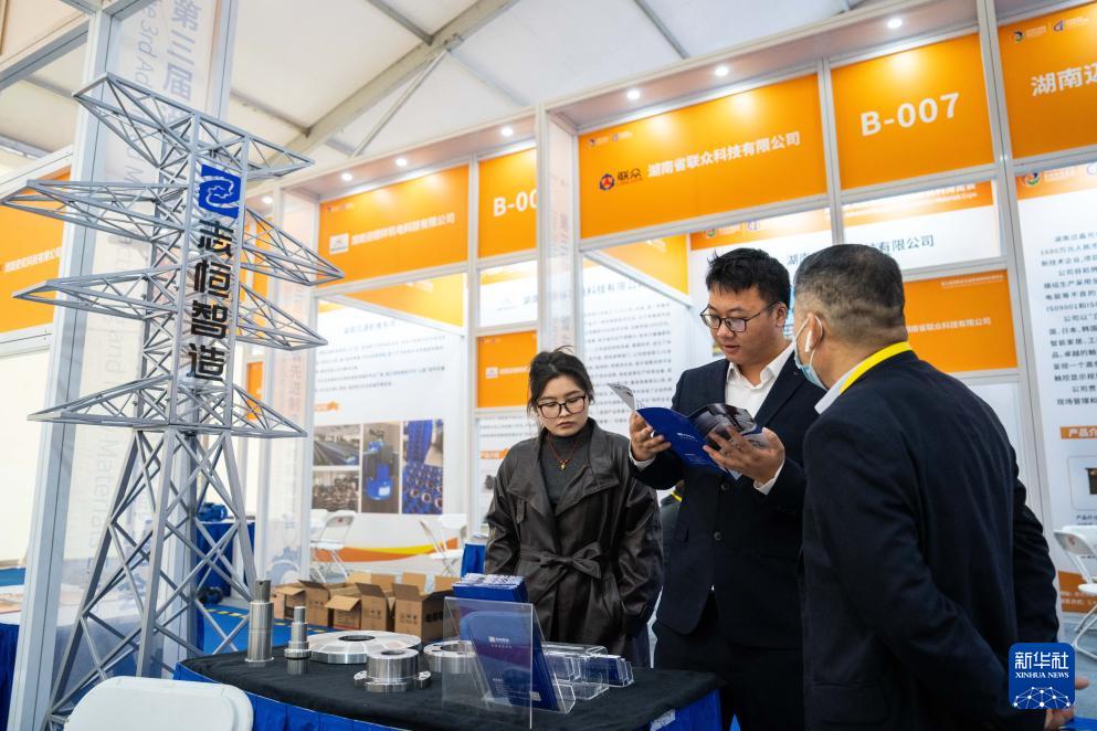 11月27日,在婁底經(jīng)開區(qū)電力科技谷,參觀者(右一)在了解高強(qiáng)度緊固件產(chǎn)品。