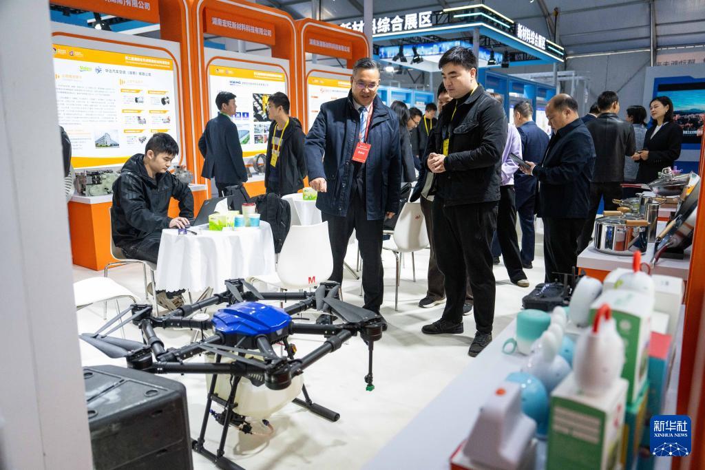 11月27日,在婁底經(jīng)開區(qū)電力科技谷,參觀者(中)在了解一款農(nóng)用無人機(jī)。