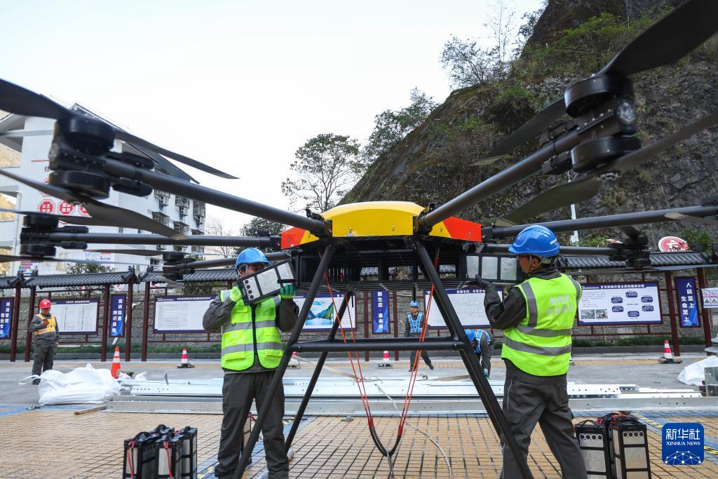 11月27日,在重慶市巫溪縣中梁鄉(xiāng)35千伏西土線(xiàn)改造現(xiàn)場(chǎng),現(xiàn)場(chǎng)工作人員為無(wú)人機(jī)更換電池。