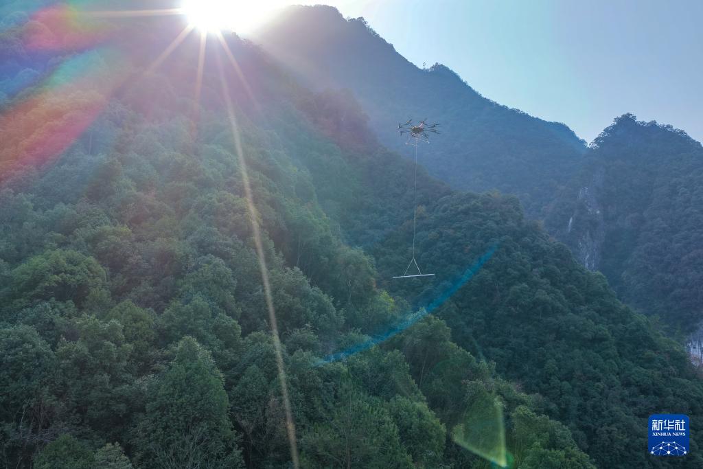 11月27日,在重慶市巫溪縣中梁鄉(xiāng)35千伏西土線(xiàn)改造現(xiàn)場(chǎng),重載無(wú)人機(jī)在吊運(yùn)新建鐵塔塔材(無(wú)人機(jī)照片)。