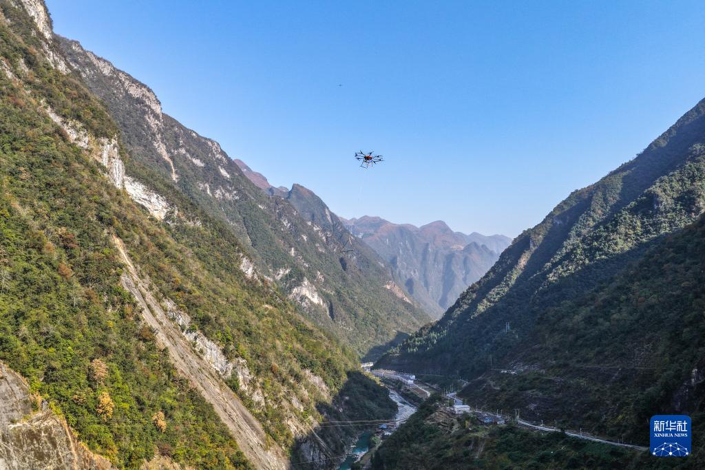 11月27日,在重慶市巫溪縣中梁鄉(xiāng)35千伏西土線(xiàn)改造現(xiàn)場(chǎng),現(xiàn)場(chǎng)工作人員操作重載無(wú)人機(jī)吊運(yùn)新建鐵塔塔材。