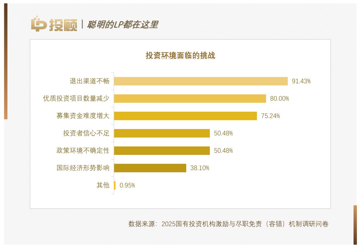 然而,機(jī)構(gòu)對(duì)市場(chǎng)挑戰(zhàn)的認(rèn)知高度集中。高達(dá)91.43%的受訪機(jī)構(gòu)將“退出渠道不暢”列為首要挑戰(zhàn),這一比例遠(yuǎn)超“優(yōu)質(zhì)項(xiàng)目減少”(80.00%)和“募資難度增大”(75.24%)。退出端的堰塞湖效應(yīng)正向上游傳導(dǎo),嚴(yán)重制約了DPI等關(guān)鍵業(yè)績(jī)指標(biāo)的達(dá)成,進(jìn)而影響新一輪的募資與投資能力,“退出難”已成為制約國有資本循環(huán)效率的一大阻礙。