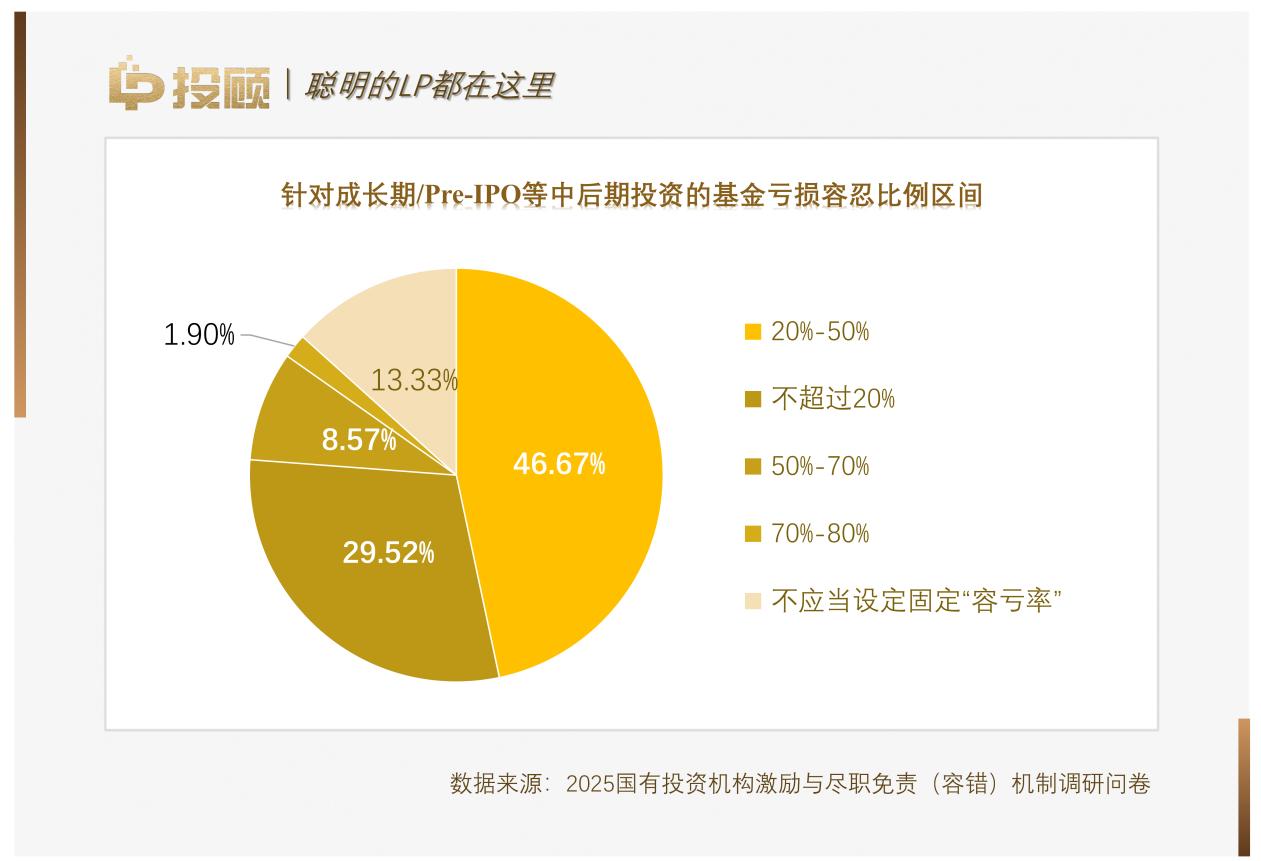 在如何設(shè)定風(fēng)險(xiǎn)底線這一核心問題上,行業(yè)態(tài)度發(fā)生了較大轉(zhuǎn)變。在此前三年的調(diào)研中,約半數(shù)機(jī)構(gòu)反對(duì)設(shè)置固定的容虧比例,傾向于彈性管理。然而2025年的調(diào)研顯示,僅16.19%和13.33%的機(jī)構(gòu)分別在早期和中后期投資中堅(jiān)持“不應(yīng)當(dāng)設(shè)定固定容虧率”,多數(shù)機(jī)構(gòu)轉(zhuǎn)而尋求明確的、可量化的虧損容忍比例,以此作為合規(guī)免責(zé)的硬性依據(jù)。