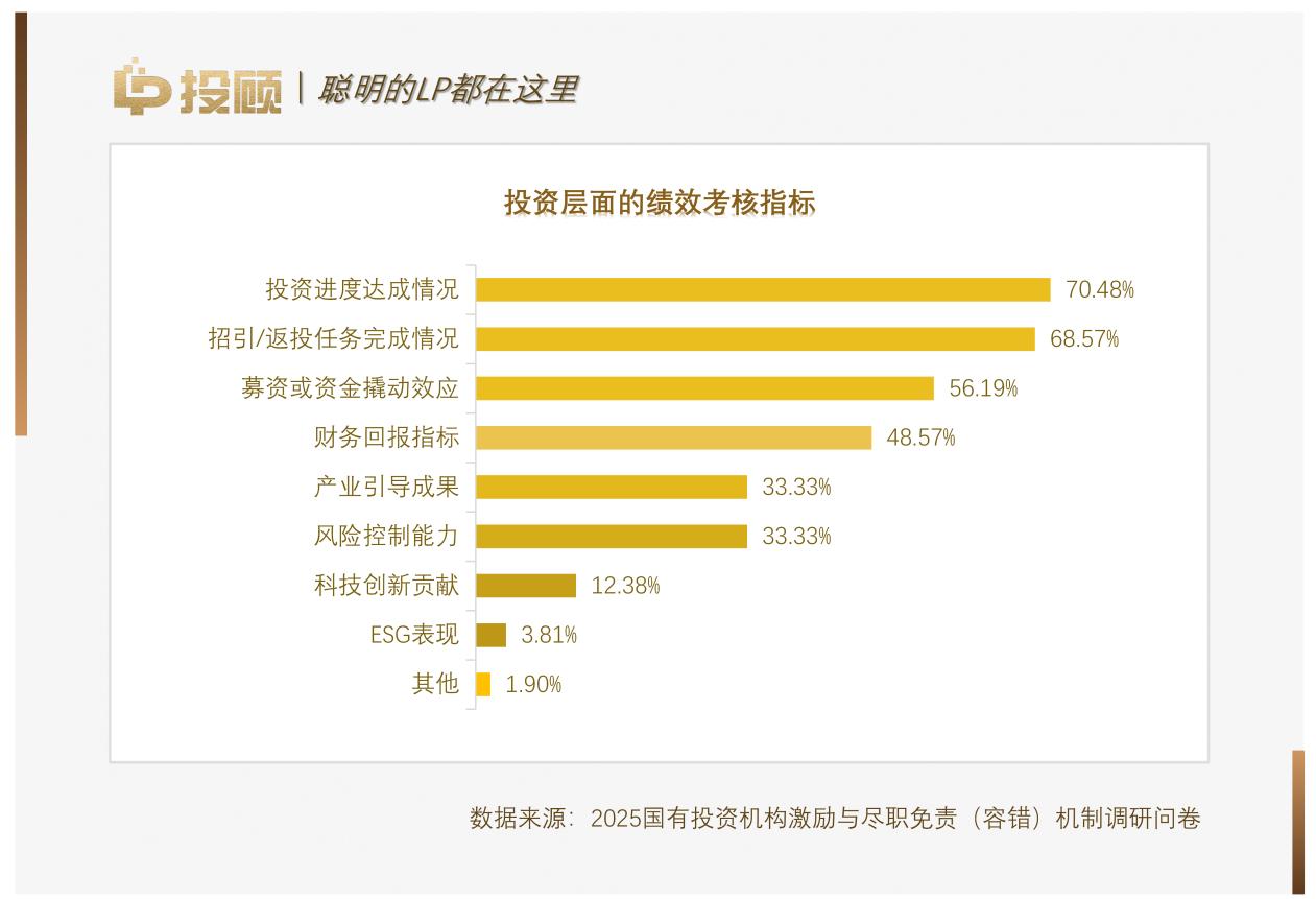 國有投資機(jī)構(gòu)的績(jī)效考核體系正在發(fā)生深刻的結(jié)構(gòu)性調(diào)整,充分體現(xiàn)了國有資本作為“耐心資本”的政策屬性。調(diào)研統(tǒng)計(jì)發(fā)現(xiàn),在投資層面的考核指標(biāo)中,“投資進(jìn)度達(dá)成情況”與“招引/返投任務(wù)完成情況”分別以70.48%和68.57%的占比位居前兩位。
