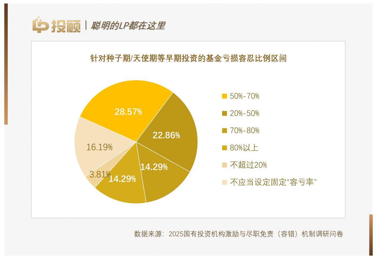 數(shù)據(jù)進(jìn)一步揭示了受訪機(jī)構(gòu)對(duì)不同投資階段差異化的風(fēng)險(xiǎn)認(rèn)知。針對(duì)種子期和天使期等早期投資,機(jī)構(gòu)展現(xiàn)出較高的包容度,28.57%的機(jī)構(gòu)認(rèn)為容虧率可設(shè)定在50%至70%之間,甚至有14.29%的機(jī)構(gòu)接受80%以上的虧損率。