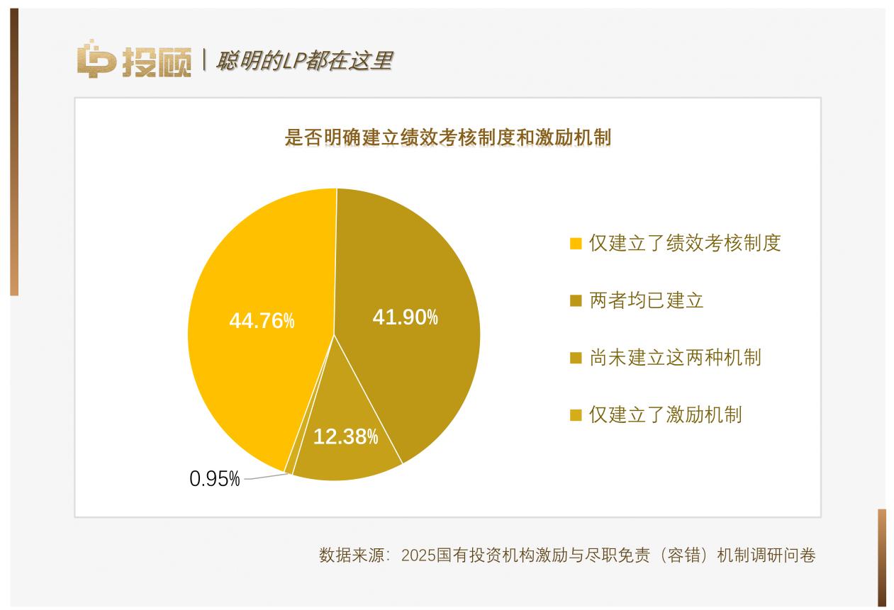 在激勵(lì)機(jī)制方面,調(diào)研揭示了國有機(jī)構(gòu)面臨的尷尬處境。雖然86.66%的機(jī)構(gòu)已建立了績(jī)效考核制度,但僅有42.86%的機(jī)構(gòu)建立了配套的激勵(lì)機(jī)制。在已建立激勵(lì)機(jī)制的機(jī)構(gòu)中,晉升與職業(yè)發(fā)展機(jī)會(huì)和非經(jīng)濟(jì)激勵(lì)是主要手段,而涉及真金白銀的超額收益分配(Carry)和跟投機(jī)制占比僅為兩成左右。
