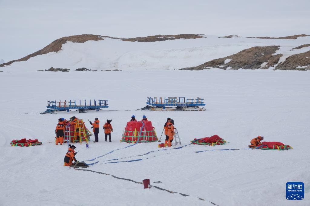 北京時(shí)間12月2日傍晚,工作人員在冰面上進(jìn)行油囊加注作業(yè)。
