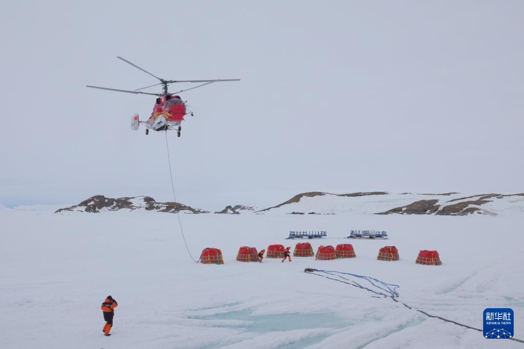 北京時(shí)間12月2日傍晚,“雪鷹102”直升機(jī)從“雪龍”號(hào)甲板飛至“雪龍2”號(hào)船側(cè)冰面作業(yè)點(diǎn),開啟油囊吊掛作業(yè)。