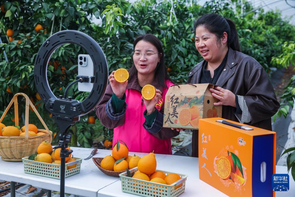 12月4日,在長興縣和平鎮(zhèn)東山村四季鮮果家庭農(nóng)場,當?shù)厍嗄曛驹刚邽檗r(nóng)戶直播帶貨紅美人柑橘。