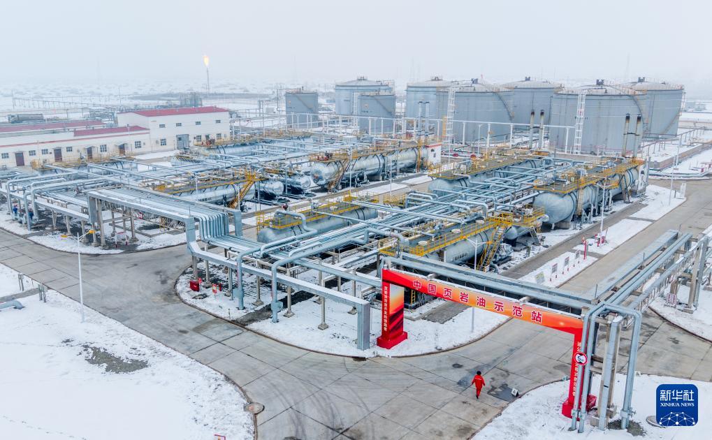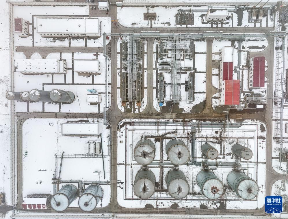 這是12月8日拍攝的新疆吉木薩爾國(guó)家級(jí)陸相頁(yè)巖油示范區(qū)中國(guó)石油新疆油田頁(yè)巖油聯(lián)合站(無(wú)人機(jī)照片)。