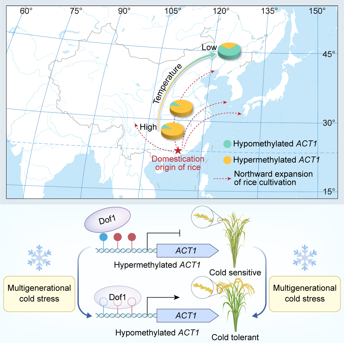 中國(guó)科學(xué)院遺傳與發(fā)育生物學(xué)研究所曹曉風(fēng)團(tuán)隊(duì)研究發(fā)現(xiàn),連續(xù)多代冷脅迫能誘導(dǎo)水稻基因組特定位點(diǎn)發(fā)生DNA甲基化變異,不僅直接參與水稻耐冷性狀的形成,還可穩(wěn)定遺傳,并在高緯度低溫環(huán)境適應(yīng)過(guò)程中發(fā)揮關(guān)鍵作用。該研究首次為延續(xù)兩百余年的“獲得性遺傳”之爭(zhēng)提供了關(guān)鍵分子證據(jù),拓展了現(xiàn)代進(jìn)化理論框架。研究同時(shí)開(kāi)創(chuàng)了定向環(huán)境脅迫的抗逆育種新思路,為應(yīng)對(duì)全球氣候變化下的農(nóng)業(yè)挑戰(zhàn)提供了新方案。研究獲Nature、Trends in Plant Science、Molecular Plant及JIPB期刊專評(píng)。