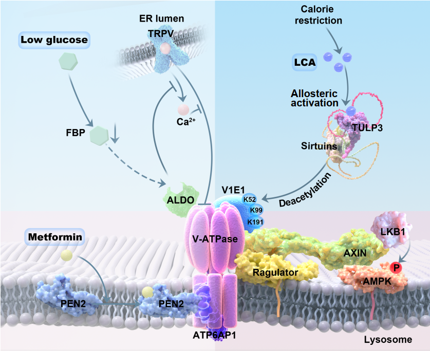 1.卡路里限制(CR)升高的石膽酸與TULP3結(jié)合,激活sirtuins,進(jìn)而去乙?;苊阁w膜里的質(zhì)子泵v-ATPase的V1E1亞基(作用于K52、K99和K191殘基),由此抑制了v-ATPase。該過(guò)程促使AXIN/LKB1轉(zhuǎn)位至溶酶體表面,由LKB1這一上游的激酶磷酸化并激活A(yù)MPK(右軸)。