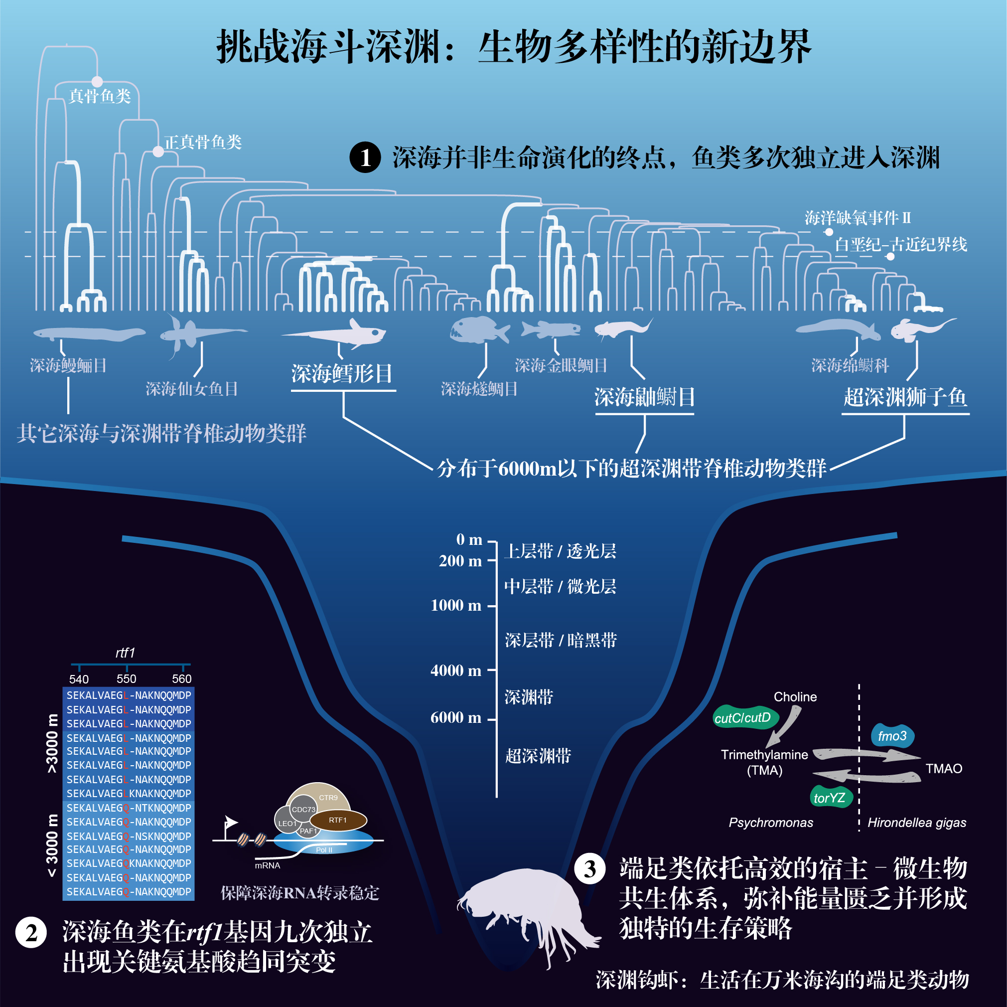 中國(guó)科學(xué)院水生生物研究所何舜平、中國(guó)科學(xué)院深??茖W(xué)與工程研究所張海濱、徐涵,聯(lián)合西北工業(yè)大學(xué)王堃和青島華大基因研究院范廣益等團(tuán)隊(duì),利用珍稀樣本與多組學(xué)數(shù)據(jù),從宏觀到微觀多維度解碼了深淵動(dòng)物的“生命密碼”。研究首次系統(tǒng)重構(gòu)了脊椎動(dòng)物多次獨(dú)立進(jìn)入深淵的演化路線圖,揭示深海并非生命演化的“終點(diǎn)”,而是孕育多次創(chuàng)新的關(guān)鍵高地。在此基礎(chǔ)上,團(tuán)隊(duì)發(fā)現(xiàn)深海魚(yú)類在分子層面通過(guò)rtf1基因發(fā)生趨同突變,從而精妙地應(yīng)對(duì)極端環(huán)境;同時(shí)揭示端足類動(dòng)物通過(guò)構(gòu)建高效的“宿主–微生物”共生體系,有效彌補(bǔ)能量輸入不足,形成獨(dú)特的生存策略。該系列成果系統(tǒng)回答了“生命如何在極端環(huán)境中演化與適應(yīng)”的重大科學(xué)問(wèn)題,為認(rèn)識(shí)地球生命極限、開(kāi)發(fā)與利用深海生物資源以及服務(wù)國(guó)家重大海洋戰(zhàn)略提供了關(guān)鍵科學(xué)認(rèn)知和重要理論支撐。