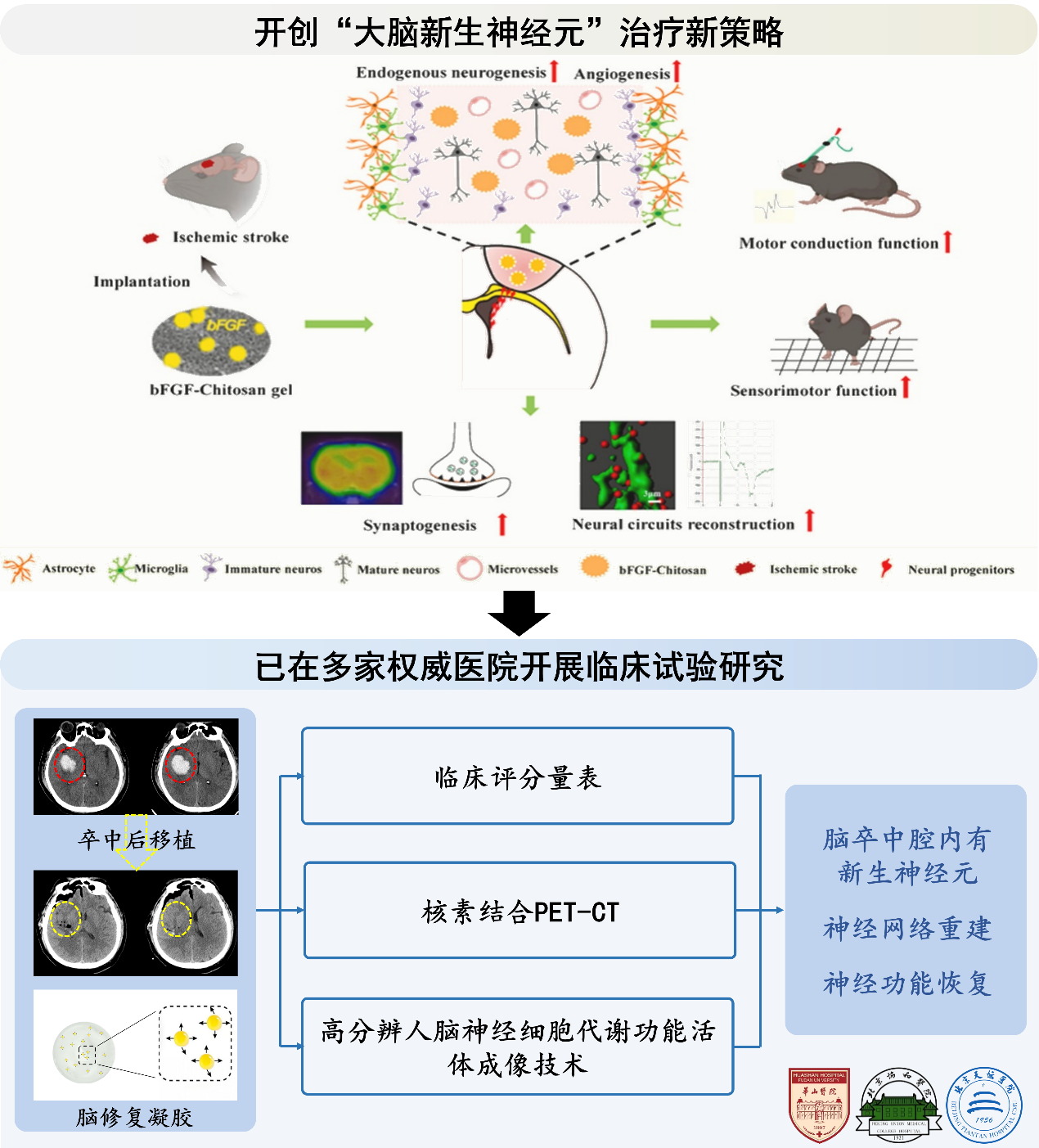 首都醫(yī)科大學(xué)/北京航空航天大學(xué)李曉光團(tuán)隊(duì)聯(lián)合上海華山醫(yī)院毛穎、陳亮團(tuán)隊(duì)、北京協(xié)和醫(yī)院包新杰及暨南大學(xué)蘇國(guó)輝院士等,突破性地開(kāi)創(chuàng)了“大腦新生神經(jīng)元”治療新策略。團(tuán)隊(duì)自主研發(fā)的“腦修復(fù)凝膠”可在注射入卒中腔后改善局部微環(huán)境(促進(jìn)血管再生、抑制炎癥反應(yīng)和瘢痕浸潤(rùn)),激活內(nèi)源性神經(jīng)干細(xì)胞,募集其遷移至卒中腔并分化和發(fā)育為成熟的神經(jīng)元。這些神經(jīng)元能與宿主腦建立功能性連接,最終導(dǎo)致感覺(jué)運(yùn)動(dòng)功能的恢復(fù)。世界卒中組織候任主席Craig S. Anderson教授評(píng)價(jià)該技術(shù)“為中樞神經(jīng)損傷修復(fù)提供了新思路”。