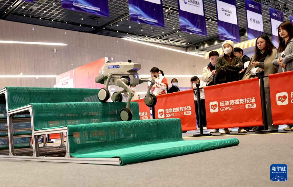 12月12日,輪式機(jī)器人在應(yīng)急救援競技場演示快速爬樓梯技能。