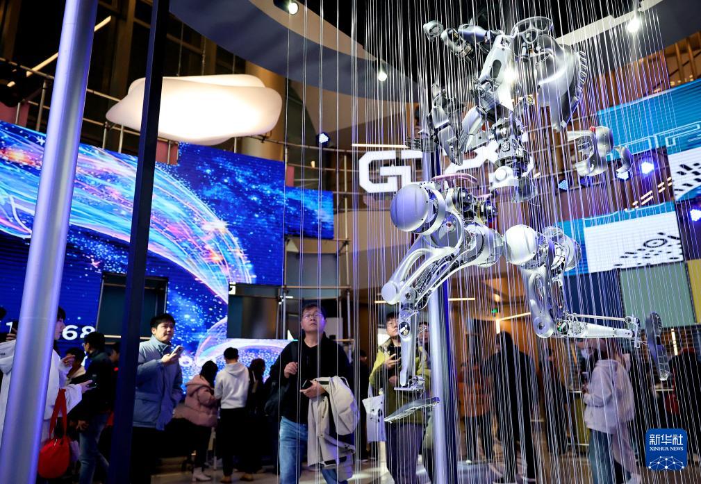 12月12日,參觀者在機(jī)器人展示裝置前駐足觀看。