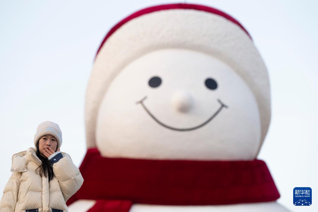 12月15日,游客在哈爾濱市群力音樂公園大雪人前合影。